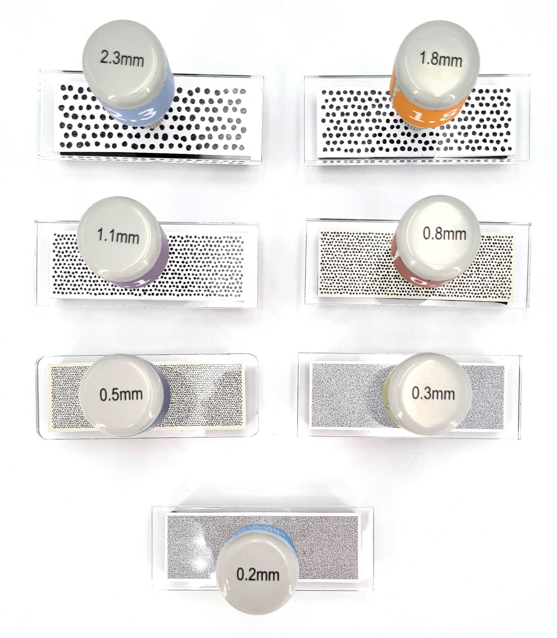 Chaque coffret contient sept tampons, avec des tailles de taches de mouchetis comprises entre 0,2 mm et 2,3 mm. Ces dimensions sont adaptées aux mesures réalisées avec les systèmes Imetrum sur des échantillons dont la taille varie de 12,5 mm à 1m. Des tampons d'encre noire et blanche sont également inclus dans chaque set, ainsi qu'un guide de sélection des tampons.