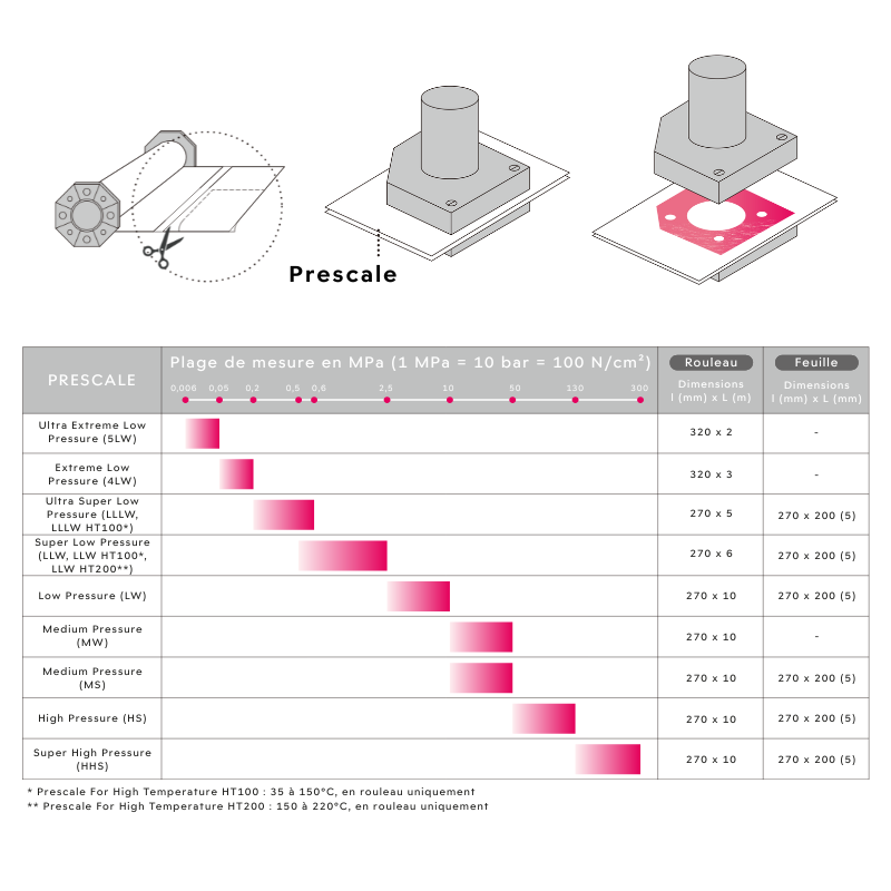 Prescale HHS est un film de mesure de pression Fujifilm à positionner entre deux surfaces d'appui. Une fois mis en compression il imprime l'empreinte du contact en couleur révélant l'image de l'interface quantifiée en pression. La lecture des couleurs, par simple comparaison visuelle de la densité de la couleur obtenue avec les couleurs de l'abaque fourni, permet d'analyser les aires de contact par niveau de pression, la pression moyenne, les valeurs locales maximales et minimales des pressions, etc.
