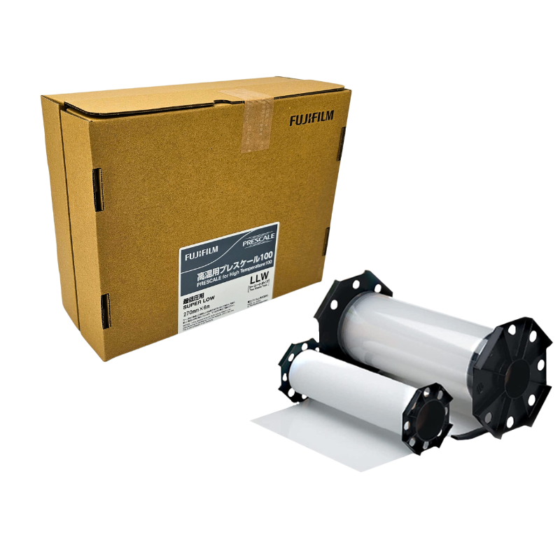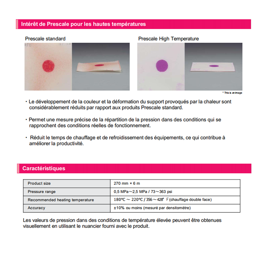 Prescale LLW HT100 est un film de mesure de pression Fujifilm à positionner entre deux surfaces d'appui. Une fois mis en compression il imprime l'empreinte du contact en couleur révélant l'image de l'interface quantifiée en pression. La lecture des couleurs, par simple comparaison visuelle de la densité de la couleur obtenue avec les couleurs de l'abaque fourni, permet d'analyser les aires de contact par niveau de pression, la pression moyenne, les valeurs locales maximales et minimales des pressions, etc.